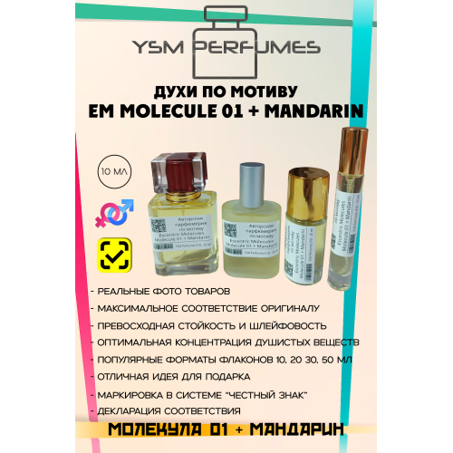 Старт: Мгновенный и мощный цитрусовый взрыв. Очень натуралистичный, сочный, кисло-сладкий. Развитие: Цитрус здесь держится дольше, чем в классических одеколонах, благодаря фиксирующим свойствам Iso E Super, но со временем он начинает стихать, уступая место древесной мягкости. Мандарин становится более акварельным и прозрачным. Шлейф: В остатке (через несколько часов) на коже остается фирменный, уютный, древесно-мускусный кокон Molecule 01 с легким, едва уловимым эхом фруктовой свежести.