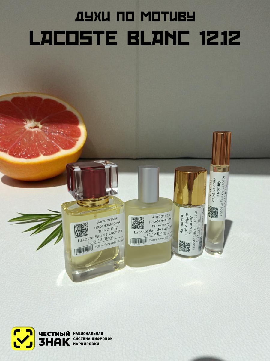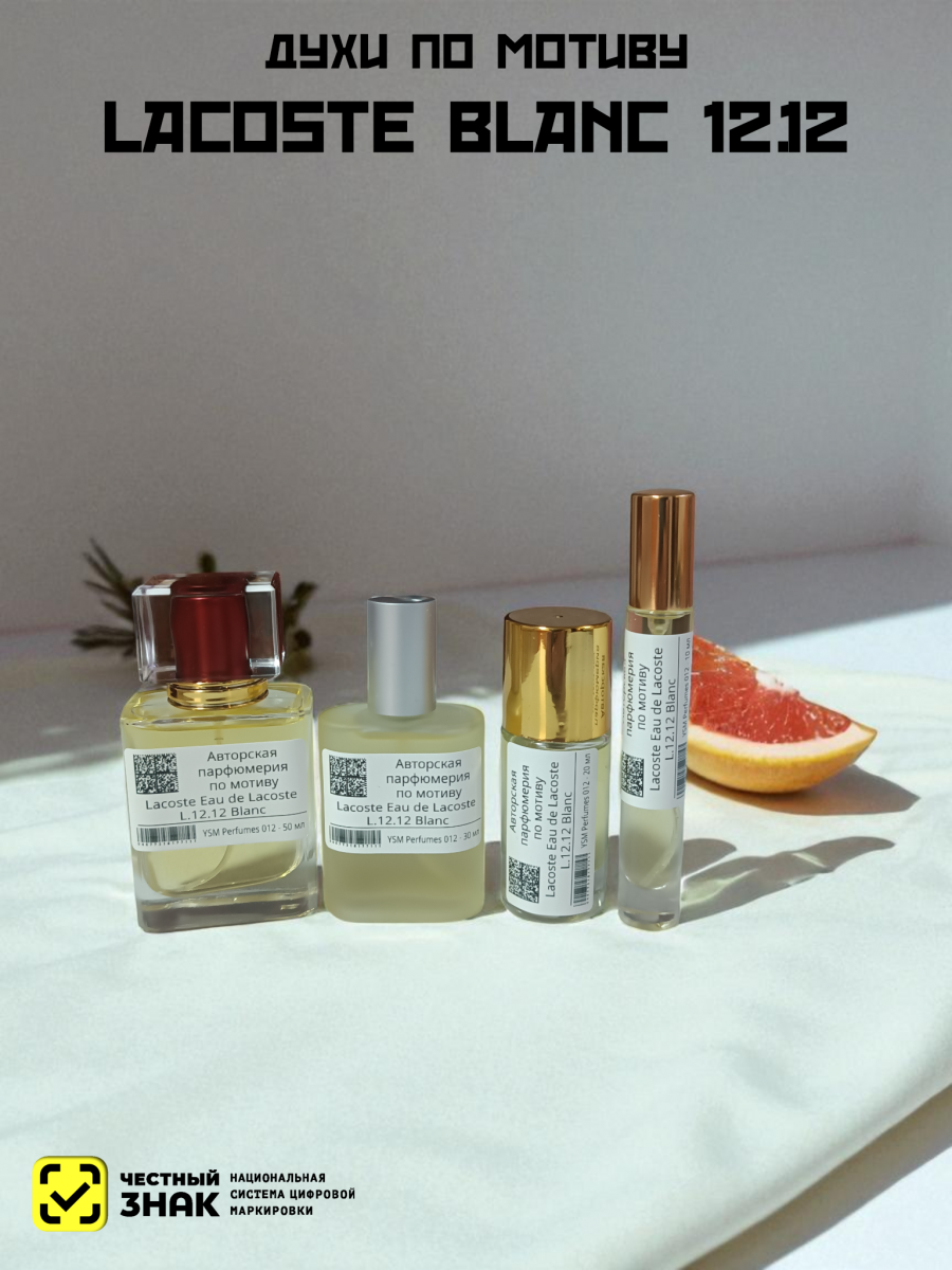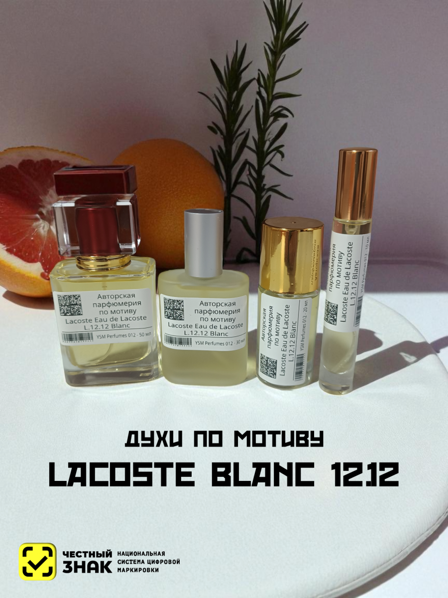 Lacoste Eau de Lacoste L.12.12 Blanc («Лакост. Вода от Лакост L.12.12 Белый») это новый, неподражаемый аромат, вышедший в свет в 2011 году. На первый взгляд, название парфюма может показаться странным, однако в этой аббревиатуре зашифровано вот что: "L" - первая буква в названии торгового дома, 1 – это символ материала, из которого шьют знаменитые рубашки поло, 2 – короткий рукав, 12 – количество тестовых образцов, созданных до выпуска продукции. Этот парфюм – прекрасная новинка для всех мужчин, неравнодушных к спорту.